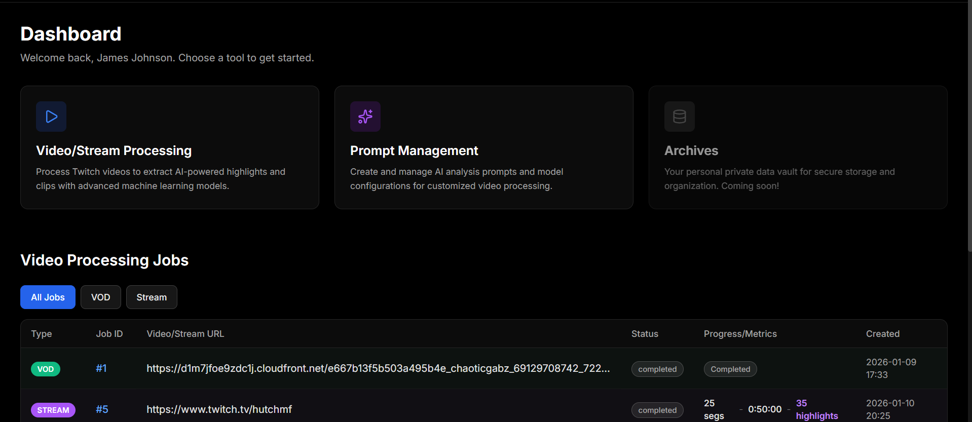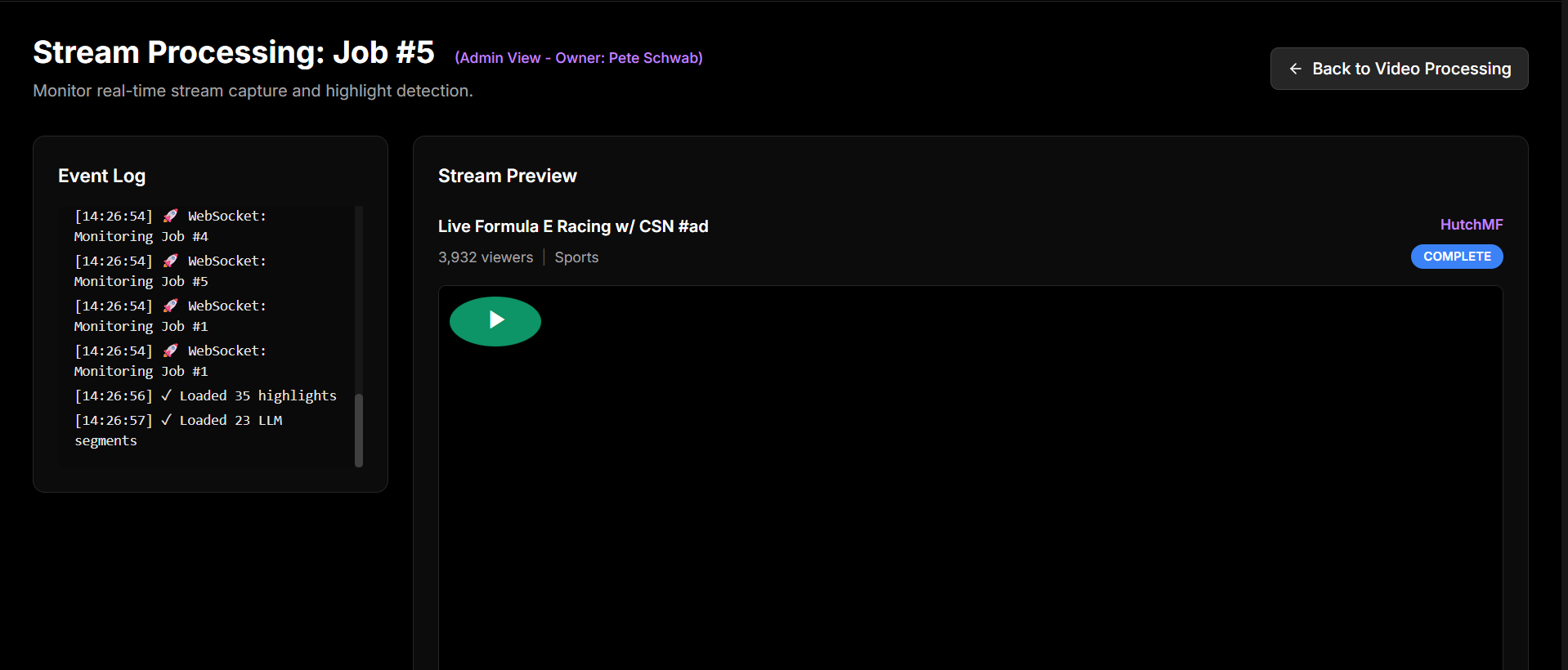 Slipstream detects, processes, and distributes key moments from video media faster than a human can. Whether it's a football game, a gaming stream, a late-night DJ set, or a wildlife cam, Slipstream is the premier solution for AI-accelerated highlight distribution.