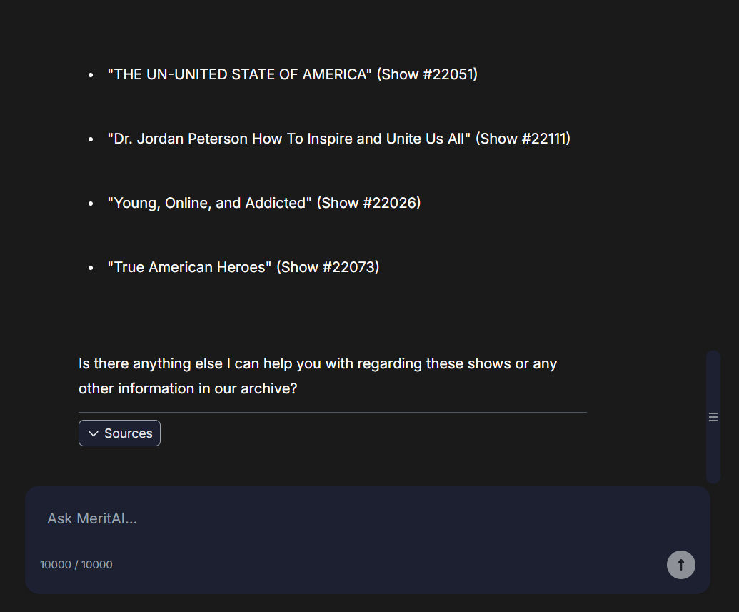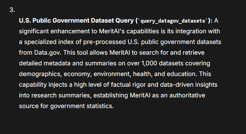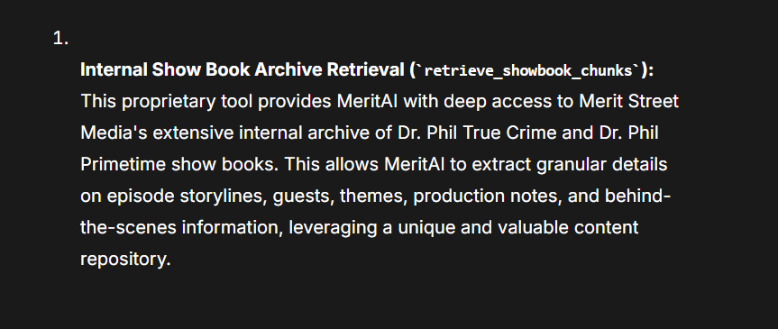 A specialized agent created for Dr. Phil's Merit Street Media. The unique architecture minimizes the learning curve for users through a proactive agent design. With access to 3 high-powered tools and multi-turn tool usage, MeritAI accelerates production workflows across a diverse range of production teams.